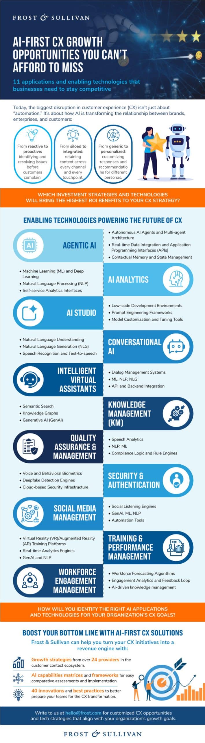 - Security & Authentication: Safeguarding CX applications with voice biometrics, multi-layer security, adaptive verification, predictive risk scoring, behavioral analytics, and automated compliance.